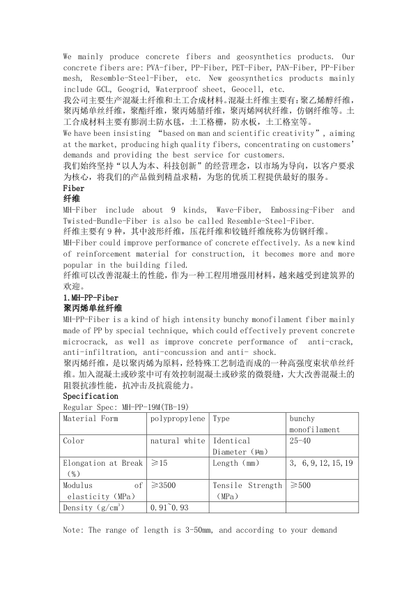 聚丙烯纤维是一种新型高分子材料,采用改性母料添加到聚丙烯切片中进行共混、纺丝、拉伸、切断而制成的用于砂浆混凝土抗裂防渗的工程纤维。该纤维经过特殊的防静电及抗紫外线处理,使纤维在混凝土中分散均匀并能长期发挥其功效;该纤维异型截面增加了纤维面积;经过化学接枝和物理改性及纤维表面处理技术使其表面粗糙多孔,大大提高了纤维与水泥基集料的结合力。单丝聚丙烯纤维加入混凝土基料中,能迅速轻易地与砂浆/混凝土材料均匀混合。由于纤维微细,比表面积大,每1 cm 3 的混凝土有近二十条纤维,故能在混凝土内部形成一种乱向支撑体系,能极有效的控制混凝土及水泥砂浆的早期的塑性收缩、干缩等非结构性裂缝的产生和发展;有效阻碍骨料的离析,阻碍沉降裂缝的形成。大大提高混凝土的抗裂、抗渗、抗冻、抗冲击、耐磨能力,同时改善其韧性和延展性,从而使建筑物的寿命大大延长。