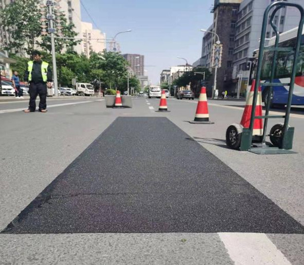 传统治理路面龟裂的方法大多是开窗式挖补回填或面层刮胶处理。开窗挖补回填法需要较长时间封闭交通,设备及人工投入较大,由于回填温度、回填密实度等原因。一般回填处很难和旧路面融为一体。特别是接缝处防水效果更差。除了开窗挖补回填还有用表面刮胶处理路面龟裂的工艺,其方法是将灌缝胶热熔后将高温的膏状胶用较大刮板延路面刮平。此方法虽然可以较快封闭路面裂缝但是对路面的摩擦力影响较大,大大降低了轮胎与地面的附着力。特别是在路面转弯处及易积水路面不建议使用此方法。